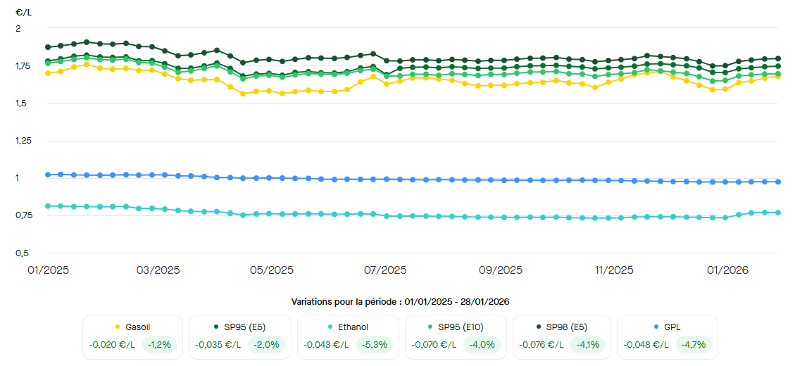 Sur une année, depuis janvier 2025, la tendance générale des prix des carburants est à la stabilité voire à une légère baisse. Le SP98 (E5), le SP95 (E5) et le SP95 (E10) ont récemment retrouvé des niveaux comparables à leurs tarifs du début de l’an passé, après avoir traversé plusieurs hausses intermédiaires. Le gazole, lui aussi, se situe actuellement à un niveau proche – et même légèrement inférieur – de celui d’il y a un an. Les carburants alternatifs, superéthanol et GPL, se distinguent toujours par leurs prix particulièrement compétitifs, restant globalement orientés à la baisse sur douze mois.