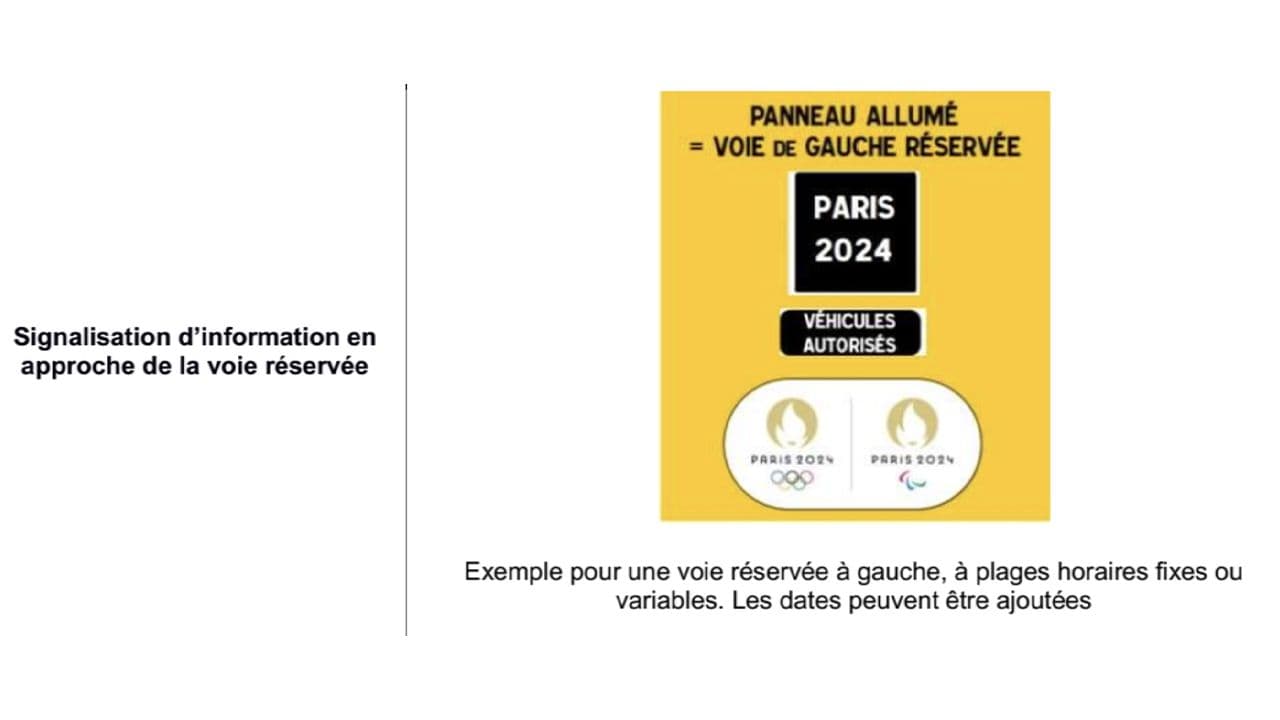 La circulation sera quelque peu chamboulée durant toute la période des Jeux Olympiques et Paralympiques 2024. Pour faciliter les déplacements, des panneaux routiers inédits seront installés pour indiquer les voies réservées aux véhicules accrédités.