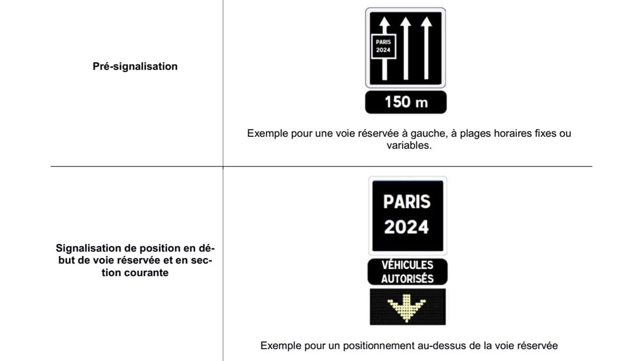 Pour faciliter les déplacements et fluidifier au maximum la circulation, de nouveaux panneaux seront installés durant toute la période des Jeux, à savoir du 1er juillet au 15 septembre 2024 inclus. L’objectif : rendre les voies réservées facilement reconnaissables.